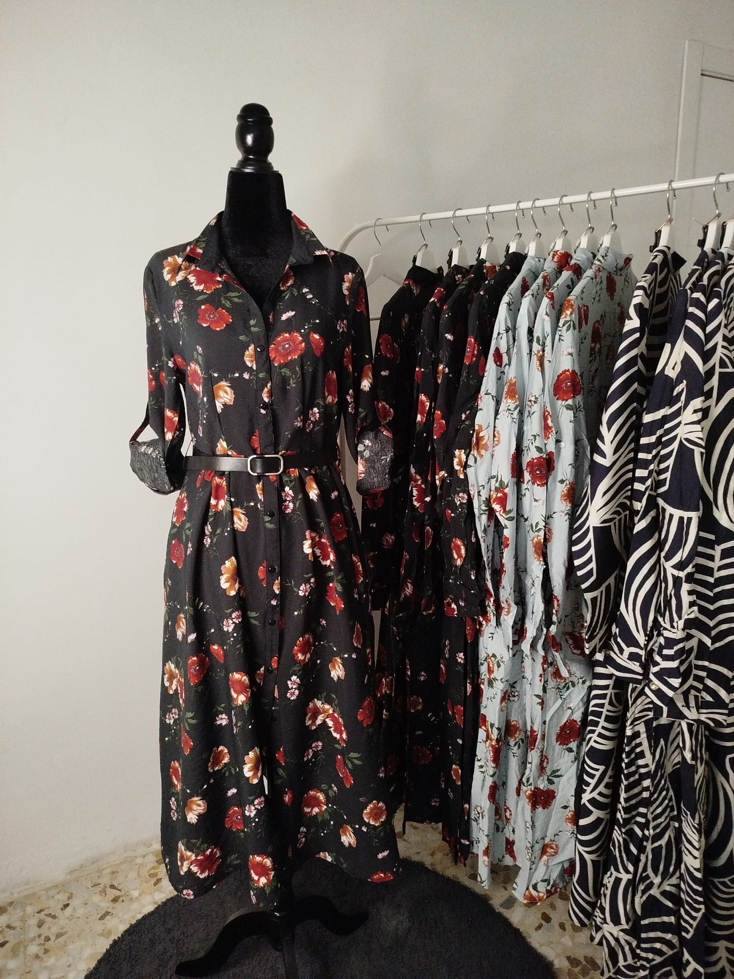 VESTIDO CAMISERO CON ESTAMPADO FLORAL Y FONDO NEGRO.