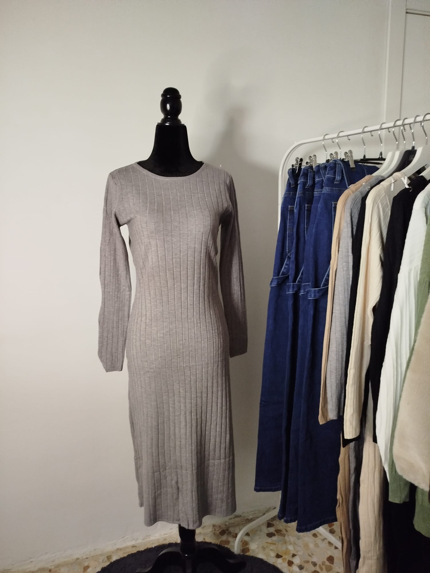 VESTIDO PUNTO FINO , CORTE MIDI Y DETALLE DE ABERTURA EN UN LATERAL.